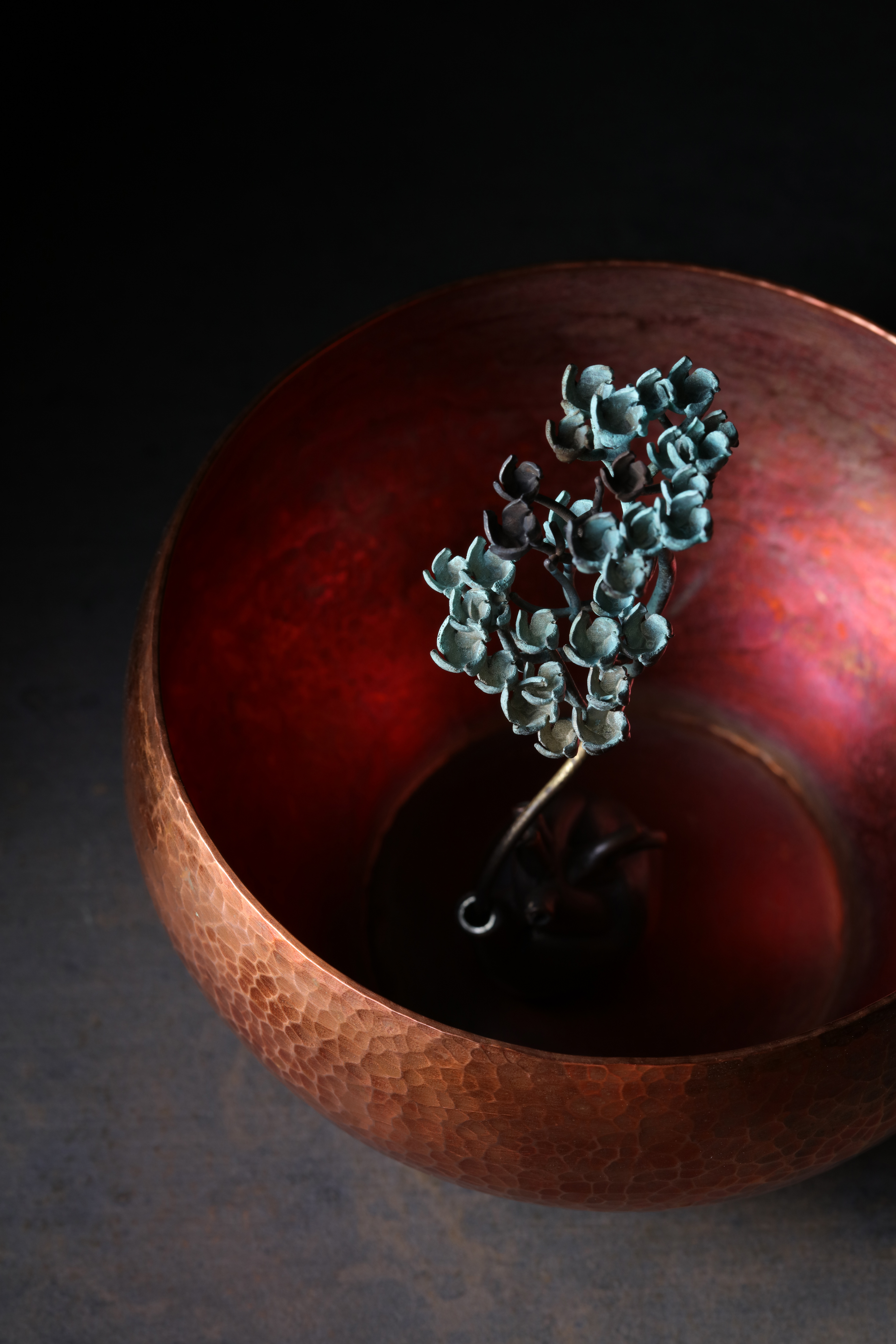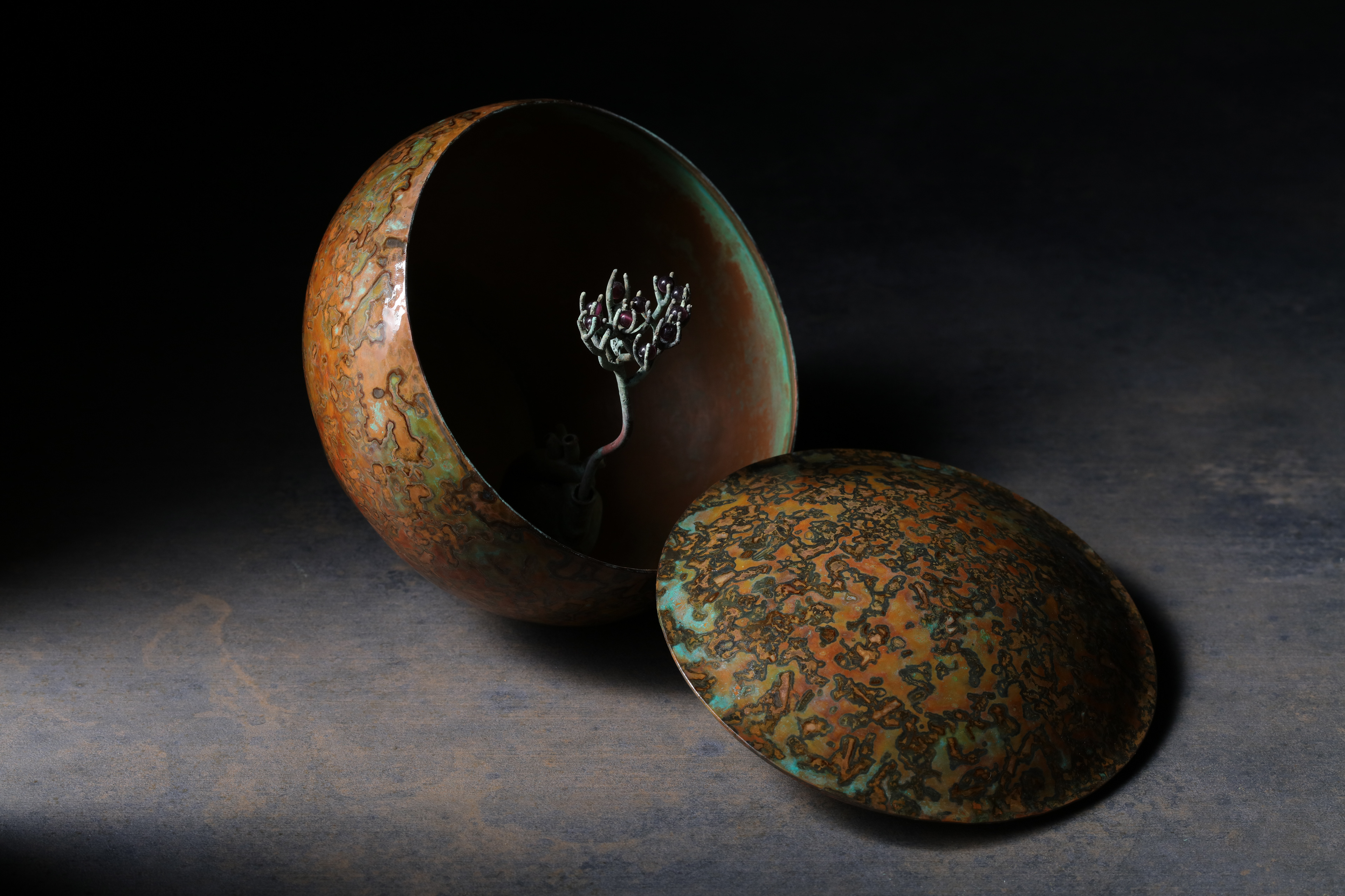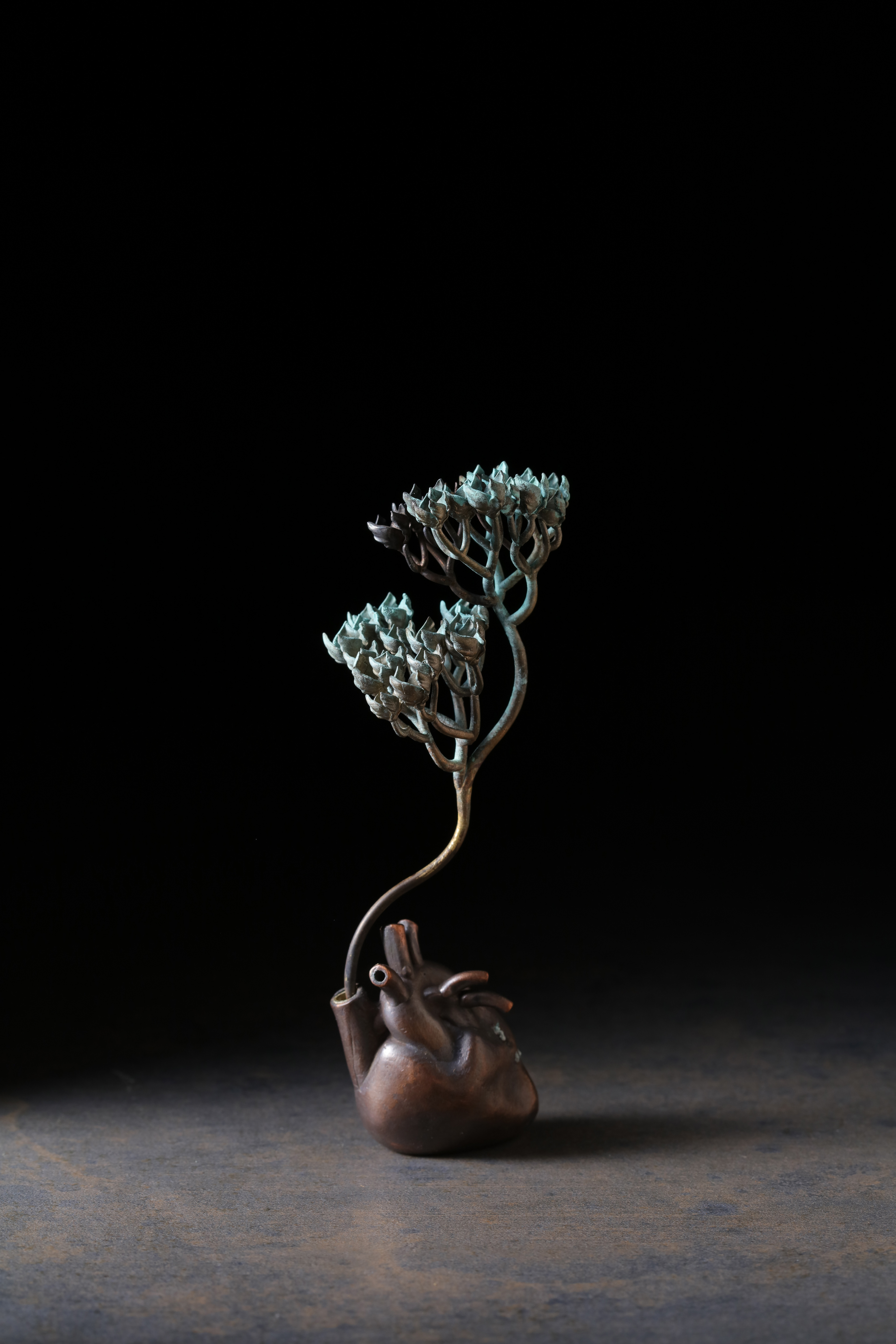 ㄧ花一世界,蒔花養慧。以缽容器作為個人修持的象徵,有各式各樣不同顏色與質感猶如不同的個體差異,內部有一微型心臟,由此心臟長出一朵心花,或像樹像果.缽體放置於仿樹根造型的平台介面,呼應生長與向著大地扎根之意像。