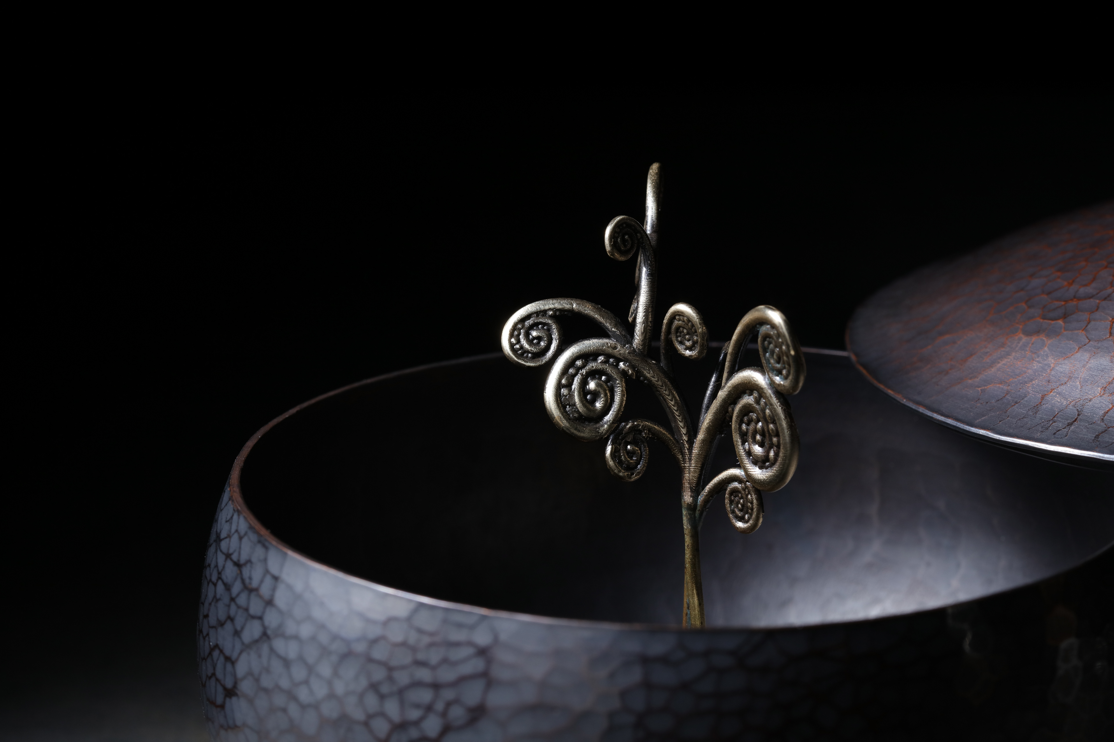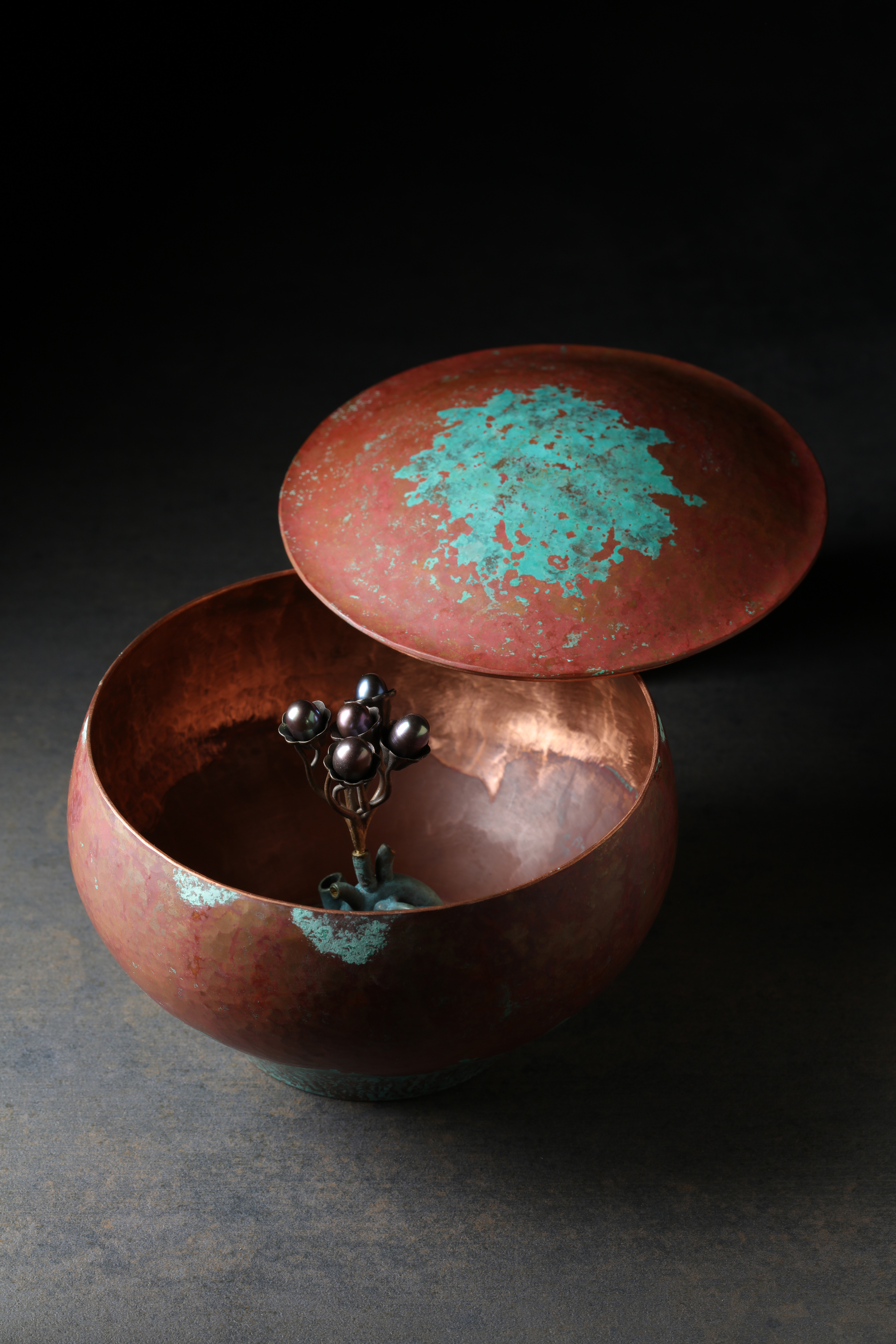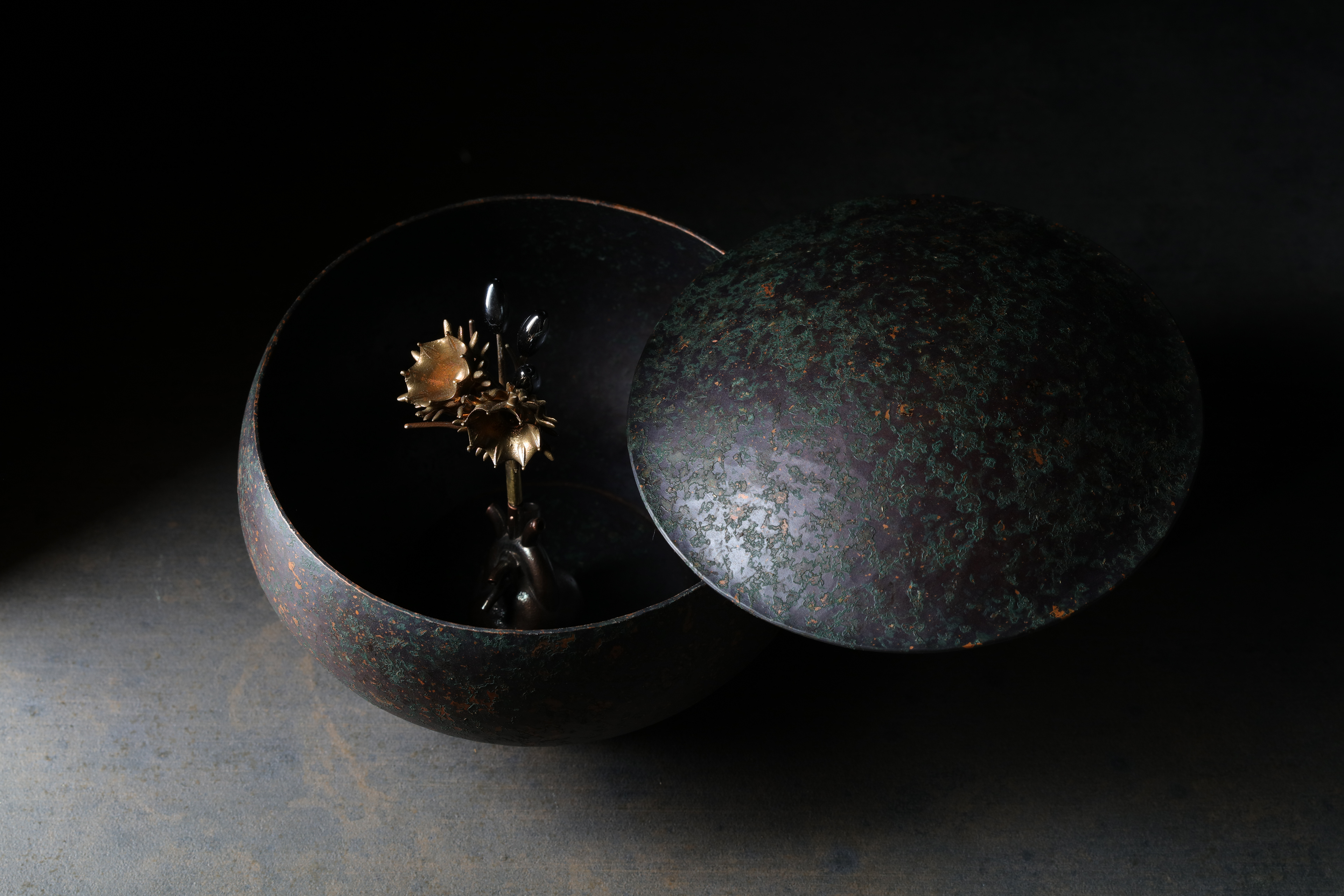 ㄧ花一世界,蒔花養慧。以缽容器作為個人修持的象徵,有各式各樣不同顏色與質感猶如不同的個體差異,內部有一微型心臟,由此心臟長出一朵心花,或像樹像果.缽體放置於仿樹根造型的平台介面,呼應生長與向著大地扎根之意像。